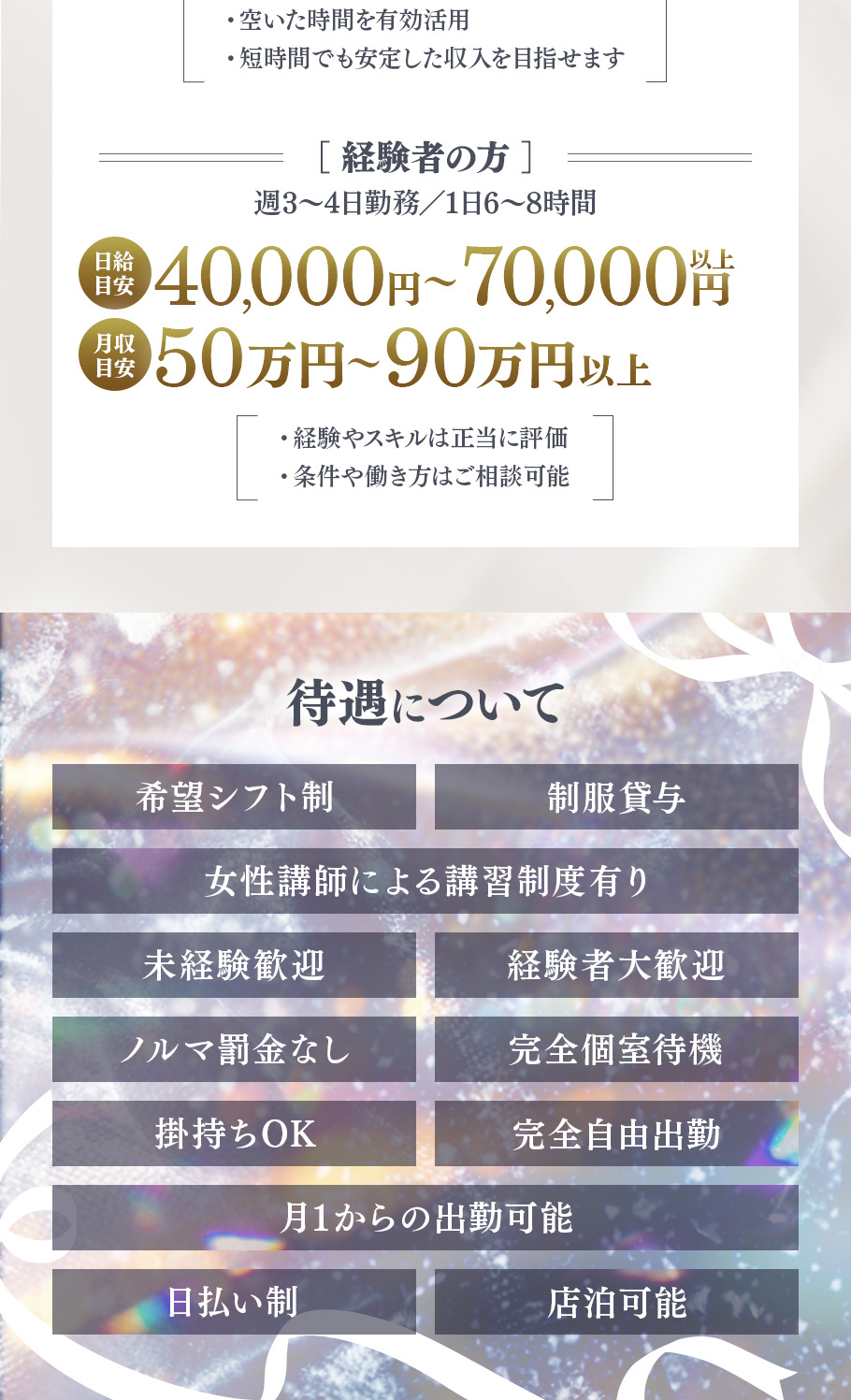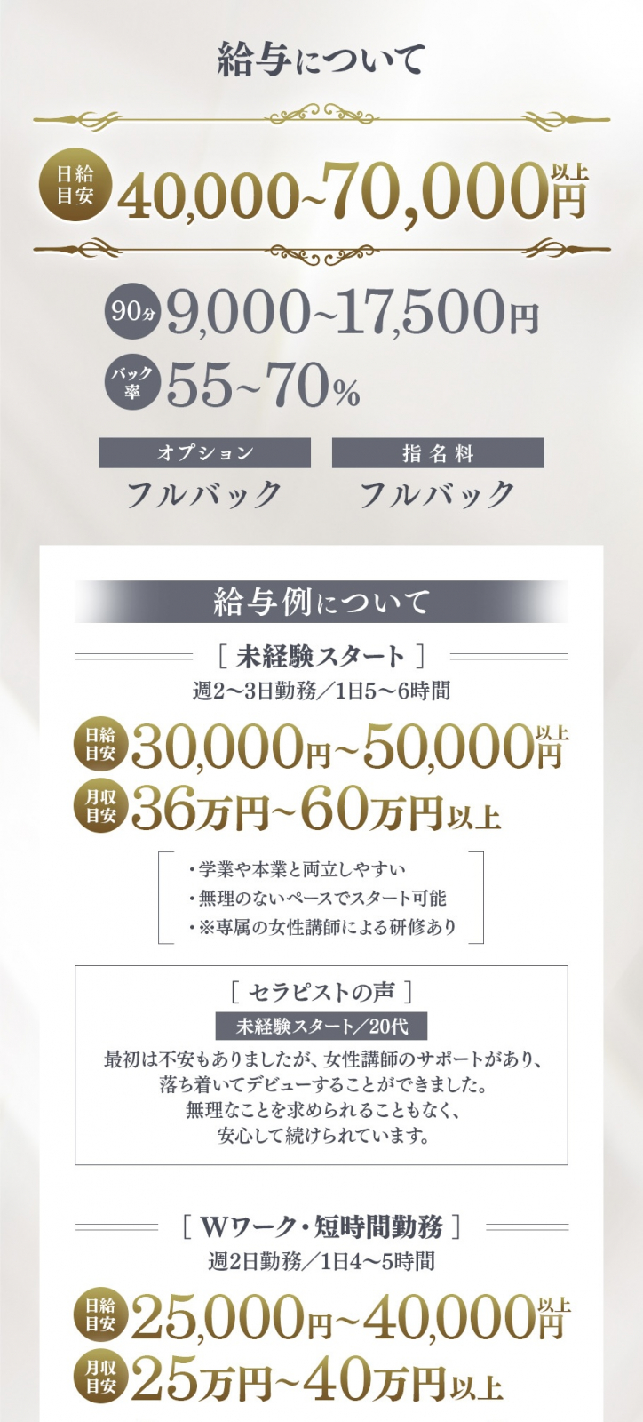 | 給与 | 施術時間に応じた歩合制です。 70分:7,000円〜15,500円 90分:9,000円〜17,500円 105分:10,000円〜18,500円 120分:12,000円〜20,500円 ・指名料、追加オプションは全額バック ・日払い/週払い対応(規定あり) ーーーーーーーーーーーーーーーーーーーーーーー ⦅収入イメージ⦆ 【未経験スタート】 週2〜3日勤務/1日5〜6時間 日給目安:30,000円〜50,000円 月収目安:30万円〜50万円前後 ・学業や本業と両立しやすい ・無理のないペースでスタート可能 ※専属の女性講師による研修あり ーーーーーーーーーーーーーーーーーーーーーーー 【Wワーク・短時間勤務】 週2日勤務/1日4〜5時間 日給目安:20,000円〜30,000円 月収目安:15万円〜30万円前後 ・空いた時間を有効活用 ・短時間でも安定した収入を目指せます ーーーーーーーーーーーーーーーーーーーーーーー 【経験者の方】 週3〜4日勤務/1日6〜8時間 日給目安:40,000円〜60,000円以上 月収目安:50万円〜80万円前後 ・経験やスキルは正当に評価 ・条件や働き方はご相談可能 ーーーーーーーーーーーーーーーーーーーーーーー セラピストの声 未経験スタート/20代 最初は不安もありましたが、女性講師のサポートがあり、 落ち着いてデビューすることができました。 無理なことを求められることもなく、安心して続けられています。 |
