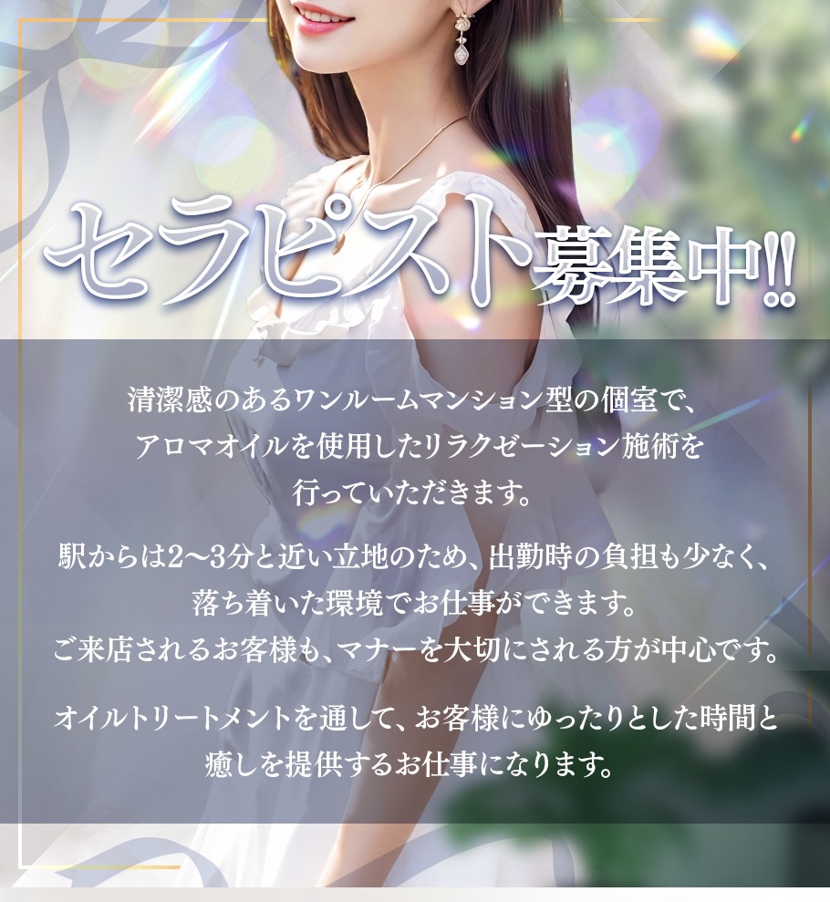 | 募集職種 | 募集職種:セラピスト ・女性スタッフによる研修あり ・店舗スタッフ常駐 ・未経験/Wワーク歓迎 |