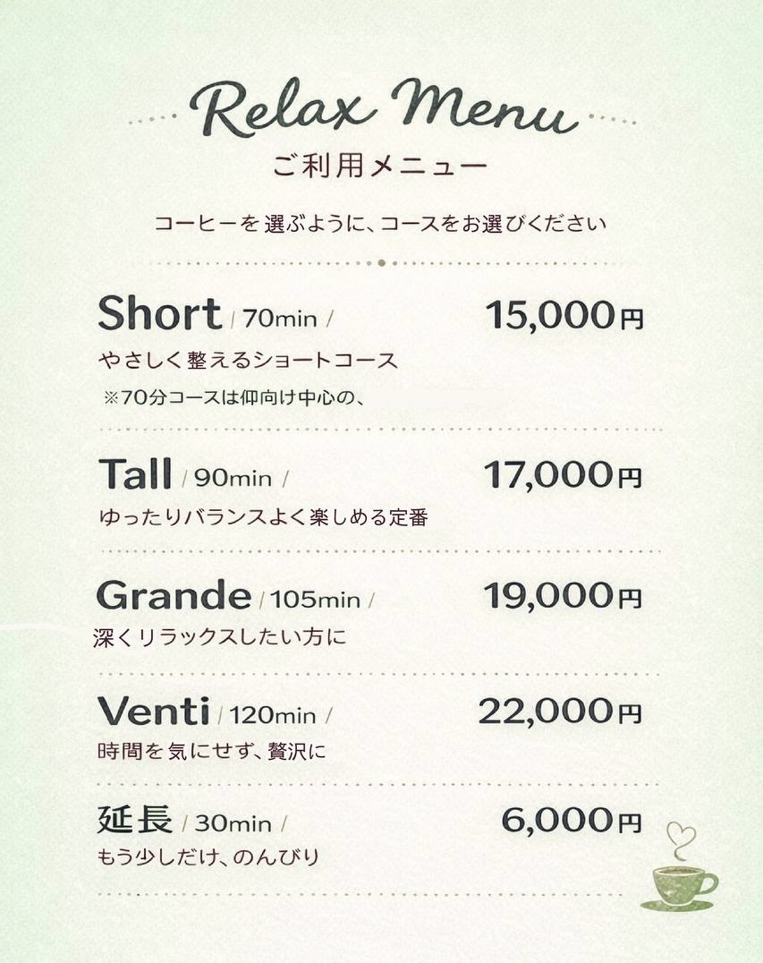 | Short 70分 (仰向け多めコース) | 15,000円 |